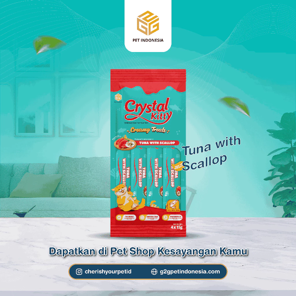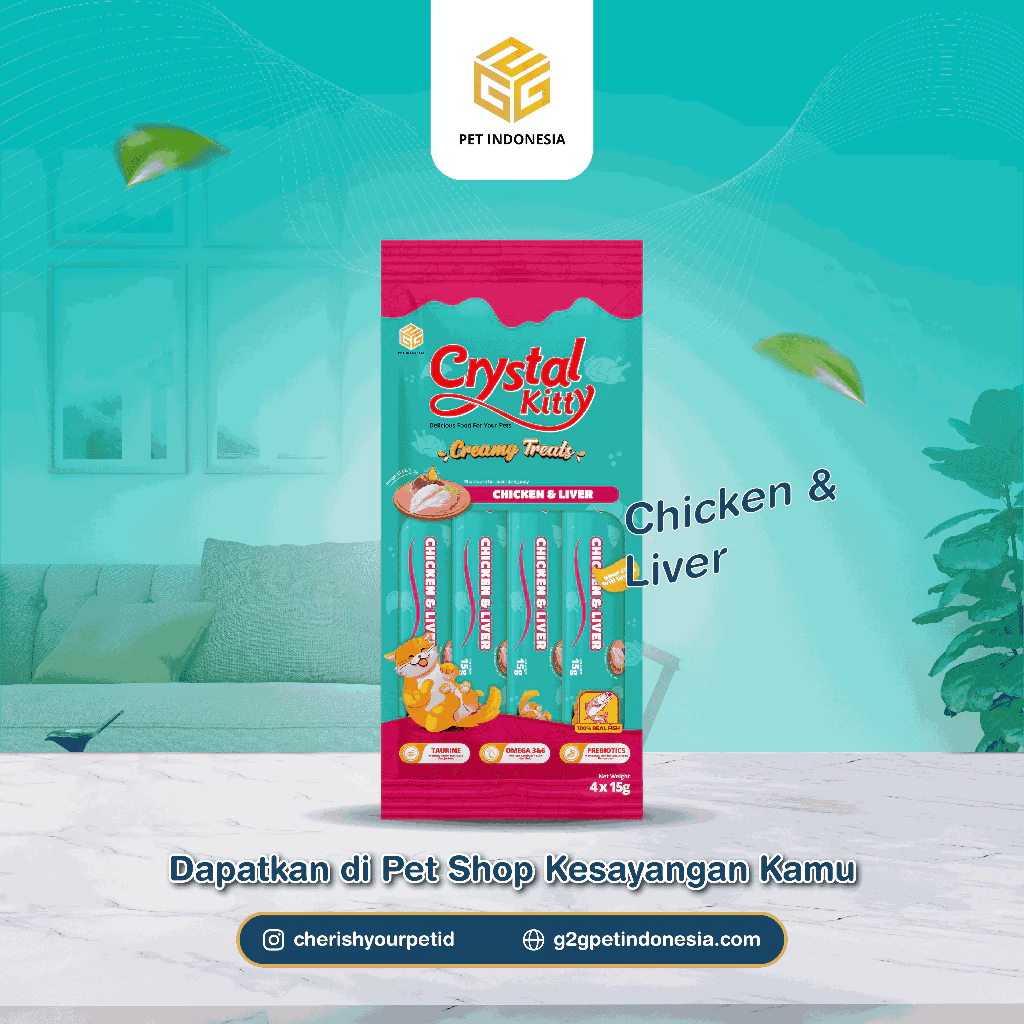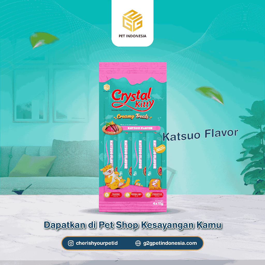Catatan: Crystal Kitty Creamy Treats hanya boleh diberikan sebagai camilan. Untuk memenuhi kebutuhan nutrisi kucing sehari-hari, tetap berikan makanan utamanya.