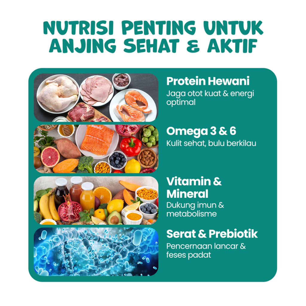 Makanan kering anjing premium dengan formulasi khusus untuk menjaga bulu berkilau & kulit sehat dalam 30 hari. Mengandung protein hewani berkualitas tinggi, omega-3 & omega-6, serta sayuran alami yang kaya vitamin dan serat. Cocok untuk semua ras dan usia, aman sebagai makanan utama harian.