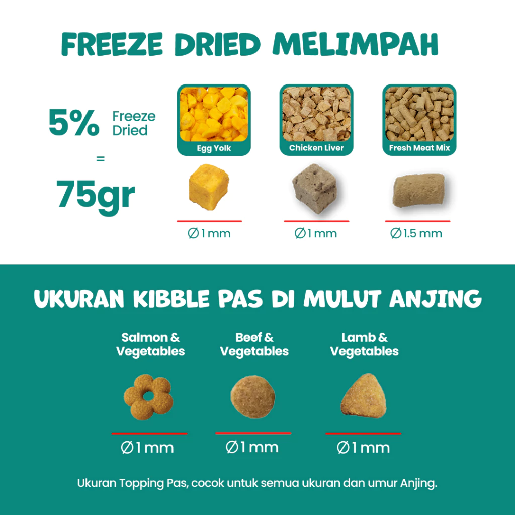 Sayuran alami memberikan serat, vitamin, dan antioksidan yang penting untuk sistem pencernaan serta imunitas. Tekstur kibble renyah dengan aroma daging sapi membuat anjing makan dengan lahap. Cocok untuk semua ras dan usia, sebagai makanan utama sehari-hari yang sehat dan bergizi seimbang.