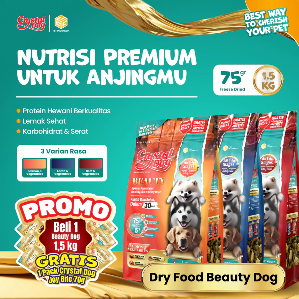 Crystal Dog Beauty Beef Vegetable adalah makanan kering anjing dengan protein sapi pilihan dan sayuran alami, diformulasikan untuk kulit sehat dan bulu berkilau dalam 30 hari. Kandungan protein hewani mendukung kekuatan otot, sementara omega-3 & omega-6 menjaga kelembapan kulit dan mengurangi masalah kerontokan bulu.